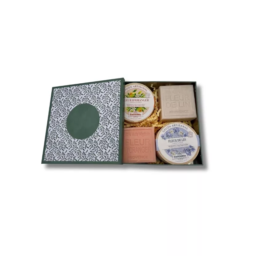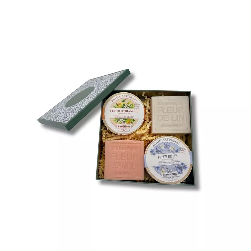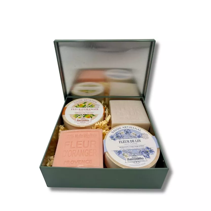 - Jabón de Flor de Lino (100 g) en caja de madera – Con fragancia fresca a Flor de Lino y enriquecido con aceite de semilla de uva, hidrata profundamente dejando un aroma delicado.