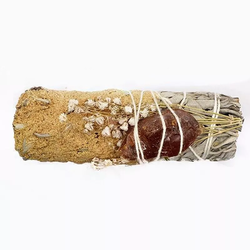1 unidad de atado purificante de salvia blanca con palo santo y ámbar de 10 cm. Ideal para limpieza energética, protección y armonización de espacios.