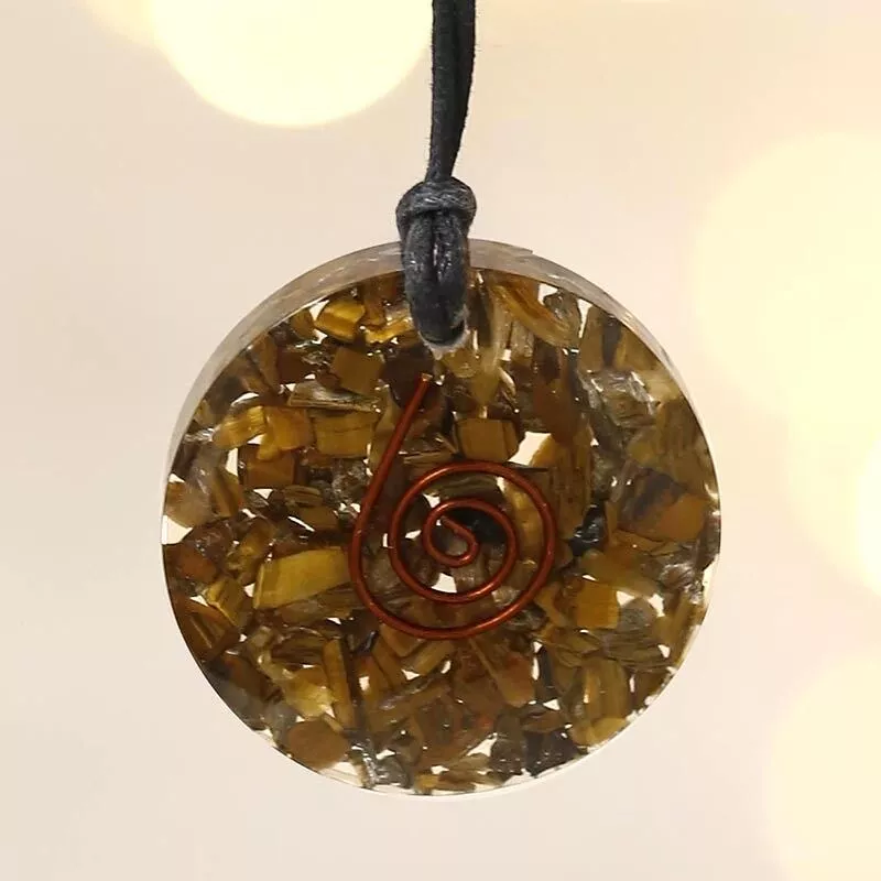 Este colgante de orgonita con ojo de tigre está diseñado como una pieza de protección energética y equilibrio personal. Elaborado artesanalmente, combina resina, virutas metálicas, espiral de cobre y piedra natural de ojo de tigre, una de las más utilizadas en joyería energética y espiritual.