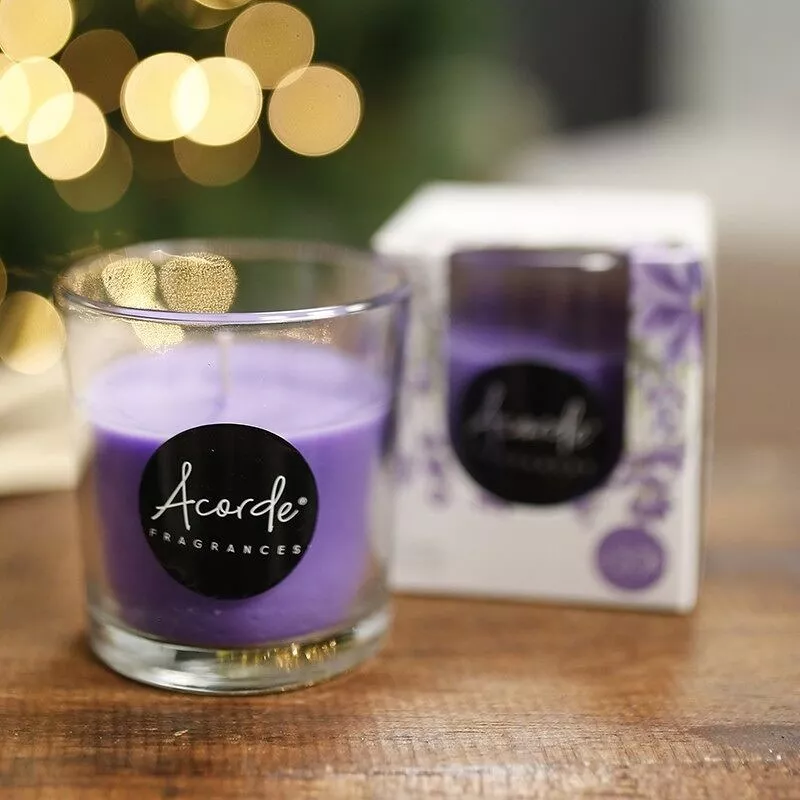 Vela aromática de lavanda en vaso de cristal. Aroma relajante con una duración aproximada de 30 horas.